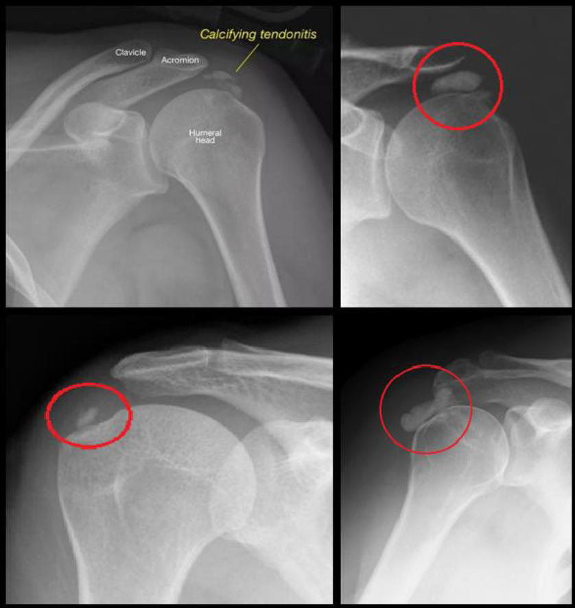 A calcium deposit accumulates in one of the tendons of the shoulder. The cause is unknown and not related to injury, diet or osteoporosis. The most common group of patients are female, 40-50 years of age, but other age groups and males can also be affected. Calcifications can have a paste-like consistency or a hard deposit in the shoulder.
