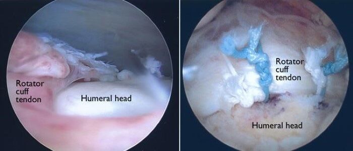 These photos taken through an arthroscope show a normal shoulder joint lining (left) and an inflamed joint lining damaged by frozen shoulder (right).
